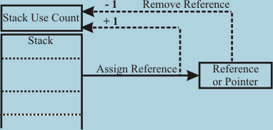 FIG. 29: Managed stack that persists as long as any references to its data persist There are, however, additional stack allocation requirements. As briefly mentioned in discussion of code from FIG. 8A and 8B, the management of stacks for stress-flow atoms creates some challenges. Suppose some data structure is allocated on stack of a stress-flow atom and another stress flow atom is called with address of the stack allocated data structure. Normally, the first stress flow atom finishing its calculations would result in destroying the stack or allocating it to another micro-thread. If this happened before the second stress flow atom accessed the data, the consequent access would result in reading invalid data. The problem could be avoided by allocating all local-use data on automatic heap rather than stack, but this solution, (resulting in some code limitation that would have to be rigidly enforced) would be fairly inefficient in case of many small variables being constantly allocated and de-allocated from the heap. The solution to this problem is a stack organization that counts all references to an instance of stack and prevents releasing/reusing a stack as long as references to it exist – as shown on FIG 29. The functioning is similar to garbage-collected (or managed) dynamically allocated heap memory blocks. Each stress-flow atom/mini-thread associated stack thus maintains the counter of references to it and persists past the last instruction of the stress flow atom instance it was generated for. Once the counter drops to zero, the stack can be released/reused.