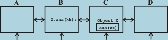 FIG. 29A: Node assignment process in mesh architecture Another issue affecting construction of stack interfaces is the need of handling the default path calls for ordered and similar stress-flow atoms. Default path calls require re-firing the ordered and similar stress flow atoms with the same set of parameters as immediately before. This requires keeping a copy of these parameters somewhere. The method of stack operation based on previous art concepts would allocate or assign a stack right after the lock of a stress flow atom was reserved. The parameters would then be pushed onto the stack and a new stress-flow atom scheduled. In case this was a default call, the previous parameters stored somewhere would now have to be pushed on the newly allocated/assigned stack. On some large number processor system, several parts of such scheme would be inefficient even without default path support. Consider a FIG. 29A four node part of “mesh” multi-processor computer with distributed memory. In such organization a node consists of a processor, memory, and interconnect circuitry to communicate with neighboring nodes. A new task (instance of stress-flow atom) has to be assigned a node as close as possible to the nodes the new task has to communicate with. This is required in order to optimize performance. Suppose we have some object X allocated in node C and node B executes code that needs to fire stress-flow atom aaa from object X. In order to be able to pass parameters, node B needs to obtain access to the stack that will be used by X.aaa instance fired by it. In this architecture this means the need to already assign node to the fired instance of X.aaa even if all the nodes around are busy and none will be able to actually run X.aaa any time soon. Since B needs to write parameters for the new instance of X.aaa, it has to be allocated somehow close to both B and C where the object X and its data reside. In the situation shown on FIG. 29A, if node C was overloaded and node A was relatively free, A would be assigned the new task due to its relative closeness to both B & C even if say node D was significantly more free than A. Performance problems with this solution come from the fact that the new node and especially new local stack had to be assigned up front at firing time, based on node loads at time moment possibly way ahead of the moment X.aaa will actually be executed. At the time X.aaa actually runs the node load situation might be totally different. The second performance problem comes from the fact that due to need to write parameters for the new stress-flow instance, the node selected for X.aaa has to be close to the node that fired it (in this case node B). It may appear that not much can be done with the problem described above. Stress-flow, however, has some unique characteristics that can be taken advantage of in order to greatly improve performance in the situation shown on FIG. 29A. Every stress-flow atom consists of the stressed and relaxed sections. The underlying principle of stress-flow is that only one process (or one mini-thread) can be inside the stressed section at the same moment. Also, once a newly fired stress-flow atom gains control of the associated lock, it does not release it until it is run and until it reaches the relaxed section. The implementation also already requires allocating data space for holding the lock data at the same scope where the stress flow atom was defined. This is also where the default-path copies of the parameters of a selected stress-flow atom types would have to be stored. But, there is nothing preventing us from reserving proper space there and storing the stress-flow atom parameters themselves. The only downside would be that doing something like that is impossible with currently available compilers.