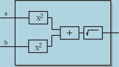 FIG. 12: An analog circuit to be emulated digitally Suppose we want to build a digital device that as fast as possible calculates a square root of sum of squares of its inputs as shown on FIG. 12. We have two inputs “a” and “b” and we calculate the square root of the sum of “a” squared and “b” squared: sqrt(a*a+b*b). The triviality of operations performed was selected in order to make the example short to code while explaining various methods of programming it in parallel. If inputs were, for example, matrices, and all the operations extremely time-consuming operations, the templates presented here would be exactly the same. If this were an analog circuit, “a” and “b” could change independently at any time and the output would always instantly reflect the result. But a digital system, by its nature, has to take a finite number of readings per time unit and process each of them one by one. A control-flow solution to the problem would simply involve a free running loop that would read “a”, read “b”, calculate the formula, and output the result. In a trivial case, such a solution would not necessarily a bad one, especially if reading of inputs required explicit action rather than happening automatically. However, big problems would occur when such a solution would be applied to a large system, with a large number of inputs and large number of outputs. First of all, such a system would be incredibly wasteful. The loop would re-process all the inputs together, at the same interval, regardless the fact that only a few inputs would change from sample to sample, with rest of them changing rarely. Second problem was inability to use structural, object-oriented methodology to implement a system based on that method. Ironically, due to lack of a better method, the loop method would often be used even in advanced systems where some of all inputs would come automatically. Rather than use this feature to improve performance, such asynchronous automatic input readings would be latched into a table of input values to be processed by the main loop whenever it was ready to do it. Such a solution was not only incredibly wasteful performance-wise, it would lead to erroneous results if not implemented correctly. Suppose, “a” and “b” changed at the same moment, but their handler wrote only “a” before the main loop fetched both new “a” and an old “b”. Old “b” could have been a value corresponding to an “a” value totally different from the current “a” value. The result would be absolutely wrong. As a result, even such unsophisticated, crude method would require working with hard to use rudimentary synchronization tools (critical sections/semaphores - hardware and/or software) to make the system work. This method would be cumbersome to use even on a single-processor system, and lacking any parallel features, due to the fact that the problem itself had plenty of natural parallelism. For example: Both squares could be calculated at the same time, and the sum and square root could be calculated while squares or new values were already being calculated. This, after all, was the essence of an analog circuit. This is exactly where the appeal of data-flow concepts came in. If we know when the inputs changed, it should be the fact of changed inputs, not some arbitrarily running control loop that should trigger the recalculation. However, the problem of proper pairing of input data remained. Prior art “virtual instrumentation” market dealt with this issue in one of two ways. First such prior-art method (used in SoftWire™ and sometimes called triggered data-flow) avoided the data-pairing issue altogether by building the code out of blocks that all had explicit control-in line triggering firing of a node’s calculations and control-out line that would be asserted when the node has finished its calculations. To implement a software instrument emulating our example, the control-in and control-out lines would be added to it. Our instrument’s control-in line would be fed into control-in lines of both square calculations. The moment the instruments’ control-in line was asserted, both “a” and “b” would be latched as input pair for calculation. The square nodes’ control-out lines would go to an AND gate. The output of the gate would go to control-in line of the addition node to initiate addition when both squares were ready. This was cumbersome, but allowed building a system where the connections handling the need for recalculations could be made after change in a single input parameter. The second method (used in LabView™) designed the system around requirement that all such related data would come together and that the system would wait until the complete set of data for the node has arrived at its inputs. Again, our entire example would be such a single instrument. The moment both new “a” and new “b” arrived, the instrument would be placed in execution queue firing the calculation of the squares. Once both squares were calculated, this would provide the set of inputs for the addition node, which would place that node in the execution queue and so on. The second method required less effort on part of the user, but would not naturally handle the case with only one parameter changing. In both prior-art methods, data passing between nodes involves latching it in storage space allocated inside each globally defined instrument, which by definition turns them into so called “static” data-flow machines thus not being able to achieve most parallelism offered by stress-flow where ability exists to run a given node on new data before the previous one has finished processing. Also, the scheduler/supervisor handling all the node dependencies/scheduling in prior art is a very complex, centralized process (see “execution map” in U.S. Patent 5,301,336) further limiting data-flow parallel capabilities. The fact that many nodes/instruments of 