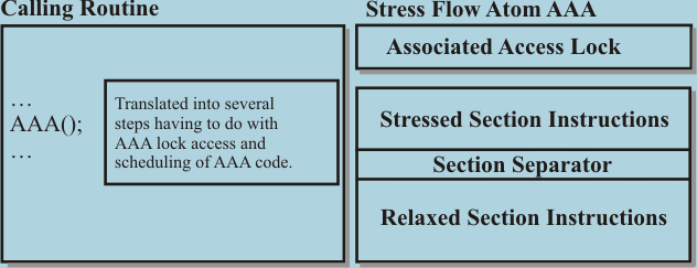 FIG. 1 Layout of a “Stress-Flow Atom” - rudimentary building block of program using stress-flow method. The underlying building block of concurrent programming using stress-flow are subroutines of special layout – further referred to as “stress-flow atoms.” Each stress-flow atom comes with a built in access/synchronization mechanism and is divided into two specific parts. These are “Stressed” and “Relaxed” sections as shown on FIG. 1. One of these parts can in special cases be empty. Very roughly - the stressed section is the part that is executed while the calling routine is constrained from doing a similar thing again. This is also where the stress-flow atom has been guaranteed exclusive access to critical context information from the calling environment. For example, the calling routine may pass an index to an array, and the called stress-flow atom may have to copy the indexed element for use later and to guarantee that the right element is used while the source array may change in the meantime. The relaxed section is entered when the stress-flow atom knows all that it needs to do its work, and so both the calling routine and our atom can go their separate ways. The concurrency definition method of stress-flow is easy to understand because it attempts to mimic the real life. For example – Imagine a boss calling on a worker to perform a task. When the task is simple, there is nothing to do in the “stressed” section. The worker simply acknowledges taking the task, begins to do it alone, while the boss can go on and do something else. However, if the task definition requires cooperation with/information from the boss or third parties, the stressed section does have some steps defined in it. The worker might need to collect details of the task from the boss. He may also need to call a third party for the task to be properly defined. All this needs to be done while the boss waits to provide further details/decision and so all this work belongs in the stressed section. In some other situations all work may involve simply coordinating with others, meaning that there is nothing to do in the relaxed section. Just as it is clear in real life – for the worker to be of any benefit, he has to tie up the boss (or other job requestor) as little as possible. Improving parallel performance in a stress-flow program requires organizing things in a way there is as little as possible to do in the stressed sections. An actual implementation of stress-flow atom in a script language such as C/C++ might use a special keyword to indicate the end of stressed section or it can use the “return” or similar existing keyword for that purpose - with everything following the return instruction(s) automatically becoming the relaxed section. Currently, code written past “return” type keywords is considered invalid “unreachable code.” Apart from the practical advantage of not needing a new keyword, the method has many additional benefits. The end of the stressed section is the last possible moment where it would make sense to return any information to the calling process – therefore, if we are to allow the useful feature of returning a value back, this is the way to do it. Internally, the implementation of a stress-flow atom binds it to a special simple critical section or lock mechanism that controls access to instances of the same stress-flow atom (or their group – this will be explained in detail later.) |
