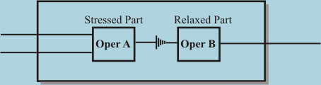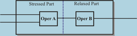 FIG. 28B: Special symbol on control line inside visual subroutine as means to represent transition from stressed to relaxed state Any interface of previous art visual programming methods can be adapted to take advantage of stress-flow, although internal workings of generated code will be completely different. Key new element of such adaptation will be a representation of transitioning from stressed to relaxed code. This can be done by means of special barrier or symbol on control line being crossed. The first method is shown on FIG. 28A where some visual programming subroutine containing two operations Oper A and Oper B uses a separation barrier between stressed and relaxed parts of visual subroutine. The second method is shown on FIG. 28B where a symbol placed on control line indicates transitioning from stressed to relaxed part. Full utilization of stress-flow might also have special visual symbols to represent ordered, last only, and redundant calls; collectors, etc. |