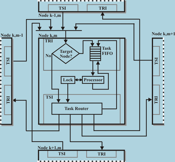 FIG. 34A: Implementation of stress-flow on distributed memory, processor-mesh type systems TRIs and TSIs implemented with distributed, decentralized architectures, are likewise decentralized. They become separate components of every node, becoming the interface connecting nodes together. Consider distributed memory, multiprocessor, two-dimensional mesh architecture previously discussed and shown on FIG. 30A. The key characteristic determining details of implementation of TRIs and TSIs here is the fact that each node is only directly connected to its neighbors, has its own memory, and can access memory of other nodes but with overhead penalty substantially increasing with number of node hops required by a specific memory access. Organization of TRIs and TSIs in such a situation is shown on FIG. 34A. The drawing shows architecture of two-dimensional mesh system with each node having only connections to four of its neighbors. The same exact concepts do apply to any mesh architectures, including more dimensional ones and one that has more connections, diagonal ones, for example. A node’s TRI is its communication input. It has one input that can receive task definitions from all four of its neighbors. When a node receives a task it checks if it is intended preferred destination using previously discussed “location” information and current node load information. If this node is not the preferred destination, the task is simply passed on to the node’s TSI, and routed further down the mesh from there. If this node is the task’s preferred destination, the task is placed in the TRI’s FIFO. The processor and a lock on this drawing are greatly simplified here, shown only to explain connections of TRI and TSI. Full architecture of these parts was shown on FIGs 31 and 31A. When the processor becomes available, it takes a task from the TRI’s FIFO and executes it. If it needs to initiate a new task, it communicates with a lock, which in turn can eventually send a new task definition to a node’s TSI. A more sophisticated organization of TRI will allow it to check/react to the neighbors’ load situation and take waiting tasks out of its FIFO and send them away if load situation changed enough to justify doing so – for example a neighbor ending all his tasks while there are several tasks waiting in FIFO here. The TSI is a node’s communication output. It has an output connecting it with TRIs of all of its immediate neighbors. The TSI looks at “location” information of all tasks sent to it, compares it against node load information and routes the task to one of its neighbors or to the task FIFO of its own node. |