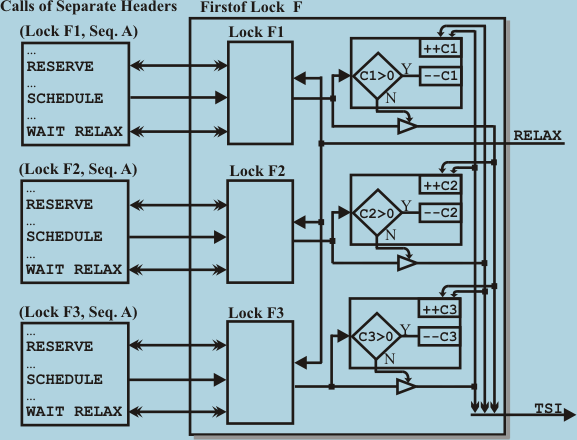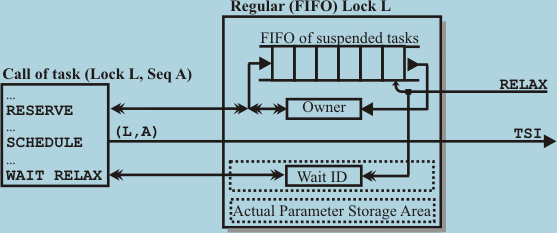 FIG. 33: Diagram of single entry point FIFO lock FIG. 33 shows single entry point FIFO lock. This is by far the most commonly used lock. It contains means to indicate if the lock is already reserved (has an owner), the FIFO and optionally built in or associated actual parameter storage area. The states this lock can be in are following: A. No owner and empty FIFO, B. An owner and empty FIFO, C. An owner and non-empty FIFO. In a practical implementation the FIFO is simply the queue of suspended tasks waiting for this lock and the owner a binary (True/False) flag and/or owner ID indicating if the owner already exists in case the FIFO is empty. If FIFO is non-empty there has to be a current owner. RESERVE command sent to this lock can either reserve the lock right-away if the lock had no owner at this moment, or it can result in placing the command sending task at the end of the FIFO and suspending it. RELAX command sent by current owner pops a suspended task from the front of the FIFO making it the owner or clears the ownership flag when the FIFO was empty. The SCHEDULE command simply sends the new task defined as pair (“Lock L”, “Sequence to Execute A”) to the Task Sending Interface (TSI). Adding the WAIT RELAX command interface to this lock is very simple. All that this requires is “Wait ID” storage for ID of a single suspended task. WAIT RELAX command issued while the lock remained in its “non-relaxed” state would simply suspend the caller and store its ID. A RELAX command restores a task identified by a non-empty “Wait ID.” Implementation of the “ordered” commands with regular FIFO lock shown on FIG. 33 requires placing a PRE-RESERVE element in the FIFO or, if FIFO is empty, taking ownership of the lock until DO-RESERVE is called and then subsequent RELAX. Normally, it is the suspended tasks that are placed in the FIFO, but with the PRE-RESERVE command, there is no suspended task to be placed there. Such construction of the FIFO lock therefore requires allocating some special structure/variable to be linked into the FIFO. The most natural location for it is the caller task stack. Such structure can therefore be allocated as part of the PRE-RESERVE command functionality, which later inserts this variable into the FIFO. This method has many advantages. There is no need to search for the PRE-RESERVE place in FIFO to issue the DO-RESERVE or UN-RESERVE commands because the FIFO element itself is directly accessible by the caller task on its stack. Also, with a compiler already supporting object-oriented mechanisms, the PRE-RESERVE and UN-RESERVE commands can be easily implemented as parts of the constructor and destructor of said structure allocated on the stack.