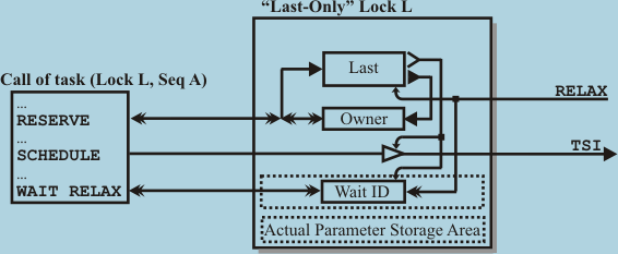 FIG. 33A: Diagram of single entry point “last-only” lock FIG. 33A shows single entry point “Last Only” lock. This lock is less commonly needed, but useful for some applications such as previously discussed electrical circuit emulation. The underlying idea is that when more one task tries to access the lock, only the most recent request past current owner is processed. This can be done one of two ways. The FIFO from FIG. 33 can be replaced with a single storage spot for one suspended task. When RESERVE command arrives, the previously stored task is “pushed out,” meaning: restored and made believe as if it actually executed its calling sequence. This involves setting the lock in the special state in which the SCHEDULE and optional WAIT RELAX commands from the pushed out task are ignored. Doing it exactly this way in situation where the lock stores the actual parameters would require being able to tell the “pushed out” task to not store the parameters or giving it a different area to store the parameters to in order to prevent corruption of parameters of currently running task. Another way of implementing “Last Only” scheme is keeping the FIFO as in FIG. 33 and storing incoming tasks as before, but having modified logic behind RESERVE command. In such a case RESERVE command would simply pop the previous element and push a new one. Ordered commands are implemented on this lock in similar fashion as with the regular FIFO lock. In spite of the fact that there might be no FIFO here there still is a need to allocate the ordered element structure on the caller’s stack since the lock’s single slot now has to point to this structure. The FIFO solution will obviously need it as well.