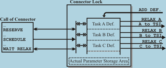 FIG. 33B: Diagram of the connector lock construct FIG. 33B shows the diagram of the connector lock construct. Even though the connector construct is a container for references to other locks, it has the same interface as a single lock and could even be implemented in hardware same way as other type locks in computer architectures geared toward stress-flow. As previously explained, the idea behind the connector construct is to be able to build a configurable list of stress-flow atoms (or independent tasks) to run. Internally, this can be a linked-list or an array containing references to separate stress flow atoms. Each such reference must always include the lock reference and identification of sequence of instructions to run. A connector construct could be static with list of tasks built at compilation time or dynamic where the tasks are added and removed as needed. Apart from interface to dynamically add tasks to the list (optionally also remove), the interface of the connector lock to the user is same as interface of other type locks. FIG. 33B shows a connector lock with three task definitions stored in it. The RESERVE command sent to the connector lock will attempt to reserve all locks of all tasks on the list together. If this is not possible, it will reserve none. One practical way to implement this construct is to loop through the list of tasks reserving their locks and let the loop be suspended by the first unavailable lock after first releasing all the successfully reserved other locks, if any. Once the suspending lock becomes available, it will restore the connector lock’s loop – which will attempt to reserve all locks again. From the standpoint of the connector construct’s caller, this is still one RESERVE command. Once the RESERVE command gets processed, the caller will proceed to the SCHEDULE command. Processing SCHEDULE command by the connector involves looping through the list and sending all tasks from the list to the Task Sending Interface. Return value processing and corresponding WAIT RELAX command are rarely needed with connector constructs since trying to return a single value from many targets does not make much sense. The scheme can still be implemented by assuming that the returned value will be the random last value returned by one task from the list. In such case WAIT RELAX would stall the caller until all tasks in the list are sent RELAX command, thus stalling the caller until all tasks from the list send their RELAX commands. The usefulness of the connector mechanism further shows advantages of passing parameters through lock structure rather than through stack. If the parameters are to be passed through stack(s), the caller has to allocate a new stack and store parameters on it. The connector in turn has to allocate a new stack for each task on the list and copy parameters to each of them. If parameters are to be passed through space allocated in the lock or with it, there is no need to allocate any stack, and a simple extension of the lock architecture can eliminate the need for copying the parameters in many cases by allowing a lock to receive a pointer to another lock storing the parameters rather than hosting parameters itself. Therefore, the connector lock or the first task on the list can be used to store the parameters and the other locks would be given a pointer to it. To allow “ordered” calls, the connector mechanism can implement mechanisms for PRE-RESERVE commands in a way described with regular FIFO lock. This requires creating a number of PRE-RESERVE data structures on the caller stack or on in a specially allocated memory block. Both methods work fine, the second one is less efficient but easier to implement without writing special compiler code. PRE-RESERVE issued to the connector lock therefore loops through the tasks on the connector’s list, allocates the needed data structure for each of them and issues the PRE-RESERVE command to each of them. The other “ordered” command implementations likewise run similar loops.