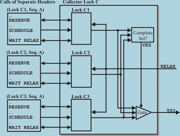 FIG. 33C: Diagram of the collector lock construct FIG. 33C shows the diagram of one way of implementing the collector lock construct with three inputs. The idea behind the collector construct is to be able to merge two or more different independently running paths into one. A collector stress flow atom has one body and several headers where all of them have to be called before the sequence of instructions of the stress-flow atom/task gets executed. The collector lock is the internal way to implement such mechanism. In order for this construct to work correctly in the normal situation of calls to separate headers coming at random moments, with possibly some paths generating many calls ahead of the others, it has to sort the incoming calls by header to which they correspond and by order in which they came. There are several ways to accomplish that. One way may involve indexing incoming calls (RESERVE requests) with the header number and inserting them inside the FIFO next to other calls from the same set. Another might involve building a special two-dimensional FIFO. FIG. 33C shows the method that was found to be superior, because it can be easily implemented out of existing constructs and because it totally eliminates any need for looping in order to insert new elements to the FIFO. FIG. 33C thus shows implementation of three header collector construct C. Locks C1, C2, and C3 are the standard, most common one input FIFO locks shown on FIG. 33. To the outside, it appears like three separate locks with standard previously discussed interface, to the associated sequence of instructions A it appears as a single lock. To make a call to first header, a calling task simply calls (Lock C1, Sequence of Instructions A) pair the same way it would call any other lock and sequence pair. To make a call to the second header, a calling task calls pair (Lock C2, Sequence A), and so on. This way the Task Sending and Task Receiving Interfaces always deal with generic pair of lock ID and sequence of instructions ID as task definitions while accomplishing variety of different functionalities. This not only greatly simplifies the whole system design, but also makes possible implementation of much of it in hardware. Step by step, the tasks calling separate headers deal with the sub-locks of the collector exactly as if they were separate locks. RESERVE command either reserves the lock right away or it suspends the caller until it can reserve it. Once the lock is reserved, the caller writes the actual parameters and proceeds to the SCHEDULE command. If the lock-storage method of passing parameters is used, it is only natural that each sub-lock provides its own storage – since each header has different parameters and often of different layout and type. The SCHEDULE command sent to a specific sub-lock passes through it but does not go to the TSI – it gets processed through the common collector lock parts (circuitry). This common circuitry counts or otherwise remembers which sub-locks processed their SCHEDULE commands. If a newly received SCHEDULE commands is the last one, completing the whole set, it goes through thus sending the (Lock C, Sequence A) pair to the TSI. If it is not the last one, it only updates the state of the collector lock properly and otherwise gets ignored. If any of the calling tasks process their WAIT RELAX commands they get stalled until scheduled sequence A processes its RELAX command. Collector lock distributes the RELAX command it receives to all its sub-locks, releasing them simultaneously. All “ordered” call functionality is accomplished by the collector lock’s individual sub-locks. No additional circuits or functionality has to be added to the common parts of the collector lock for the “ordered” calls to work. A variation of the collector construct can use the “last-only” locks from FIG. 33A instead of FIFO locks from FIG. 33, thus creating “last-only” collector lock.