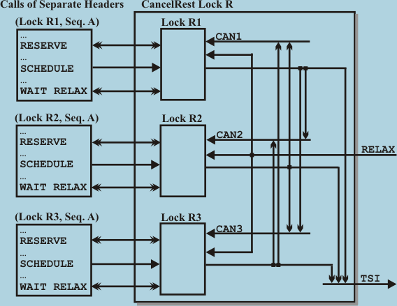 FIG. 33E: Diagram of the “cancelrest” lock construct FIG. 33E shows the diagram of one way of implementing the “cancelrest” lock construct with three inputs. Functioning of this lock is very similar to the “firstof” lock. The only difference is that “cancelrest” cancels/kills the tasks that did not make it first instead of ignoring them. Such a feature is very useful in implementing redundant calculations and many other applications where the late paths may not come through at all. Safe termination of the unneeded tasks and corresponding releasing of unneeded resources also improves system performance. The “cancelrest” uses FIFO locks as sub-components just like the previously discussed locks, but needs a new “CANCEL” internal signal for canceling an incoming task. The functioning of this signal with FIFO lock is as follows: When an “occupied” lock receives this signal, the owner of the lock is terminated and the lock given equivalent of “RELAX” command. When the lock is unoccupied (which also means its FIFO is empty), a counter similar the one discussed with “firstof” is incremented. A lock reservation request that arrives when the counter is greater than zero results in terminating the task making the request. This is true of both RESERVE and “ordered” call PRE-RESERVE command. Please note that in almost every practical programming application of this scheme the counter gets used very rarely, meaning that the CANCEL command almost always finds an occupied lock. This is especially true of the “ordered” calls where the PRE-RESERVE commands are issued at the very beginning of the process that will result calling the “cancelrest” lock. Killing incoming tasks from within the lock is easy because through its core functionality, the lock already retrieves and operates on task handles or system level task access means in order to suspend and restore the task. Killing a task cannot however involve just stopping to execute it for good. It is necessary that a task gets to execute its destructor sequences, which are placed by the compiler at the end of each sequence of instructions by every object-oriented compiler. Killing a task therefore involves suspending it and then resuming it at the beginning of its destructor sequence. This way all necessary resource reference counters are properly updated, no longer needed memory released, and persistent stack(s) status properly updated in order for it to be released when last reference is destroyed. This scheme is much easier to implement than some mechanisms within prior-art compilers such as “try/throw/catch” compiler exception construct which create and process the destructor sequences in similar way. Creating a “cancelrest” lock out of above described modified FIFO locks is straightforward as shown on FIG. 33E. The CANCEL inputs are marked CAN1, CAN2, and CAN3. An output signal from one sub-lock issues CANCEL requests to all other sub-locks and then is routed to the TSI. For example, when Lock R2 sends a task to its output, this causes sending CANCEL commands to locks R1 and R3, and then the task outputted by R2 is sent to the Task Sending Interface (TSI). The Task Receiving Interfaces (TRI) and Task Sending Interfaces (TSI) are the remaining components of processing nodes of stress-flow to be described. One of the key benefits the architecture of stress-flow is the fact that TRIs and TSIs are the only components that vary in organization in diametrically different applications of stress-flow. The key varying element of different application is how much separated different processing nodes are or how they physically communicate with one another. The other components of the architecture of stress-flow – namely the processors executing sequences of instructions and locks used to initiate other tasks need not be aware of the interconnection details. In different applications, they may pass identifications of locks and of sequences of instructions to execute in application specific format, but the key issue is that only TRIs and TSIs actually process that information, allowing almost complete portability of software developed in the spirit of stress-flow. |