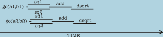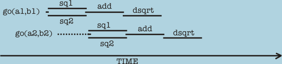 FIG. 13A: Best case execution timeline of code from FIG. 13 FIG. 13A shows best-case execution scenario where unlimited number of processors was available. Due to the fact that all code sq1 and sq2 code is in the stressed section, calculations of square on new data will not begin until previous squares are finished. New data arrives before that time, which means that, by making new calls to sq1/sq2, routine “go” gets itself suspended until previous square calculations finish up. This fact is demonstrated by dotted line representing go routine’s timeline. There is always a physical limit on time it takes to process individual set of data, which is often called latency of the system. Assuming that individual operations of calculating squares, square root, and addition cannot be broken down into smaller elements and thus be parallelized, the sum of times it takes to run single square operation plus time to run addition plus time to run the square root is the physical limit here -- the lowest latency possible. But our system also limited the frequency at which new data can be fed, in spite having numerous unused processors available. Being able to stall some actions until resources are available is often a desired action. In this case, however, we want to be able to feed and process incoming data as fast as possible.